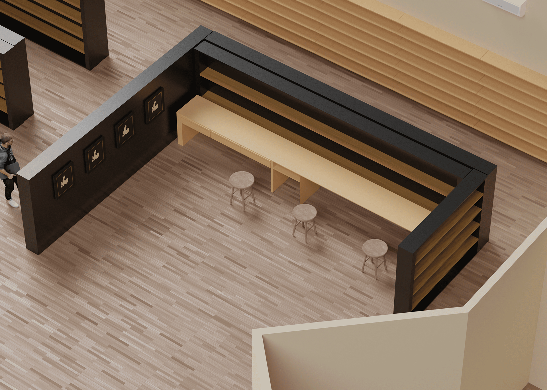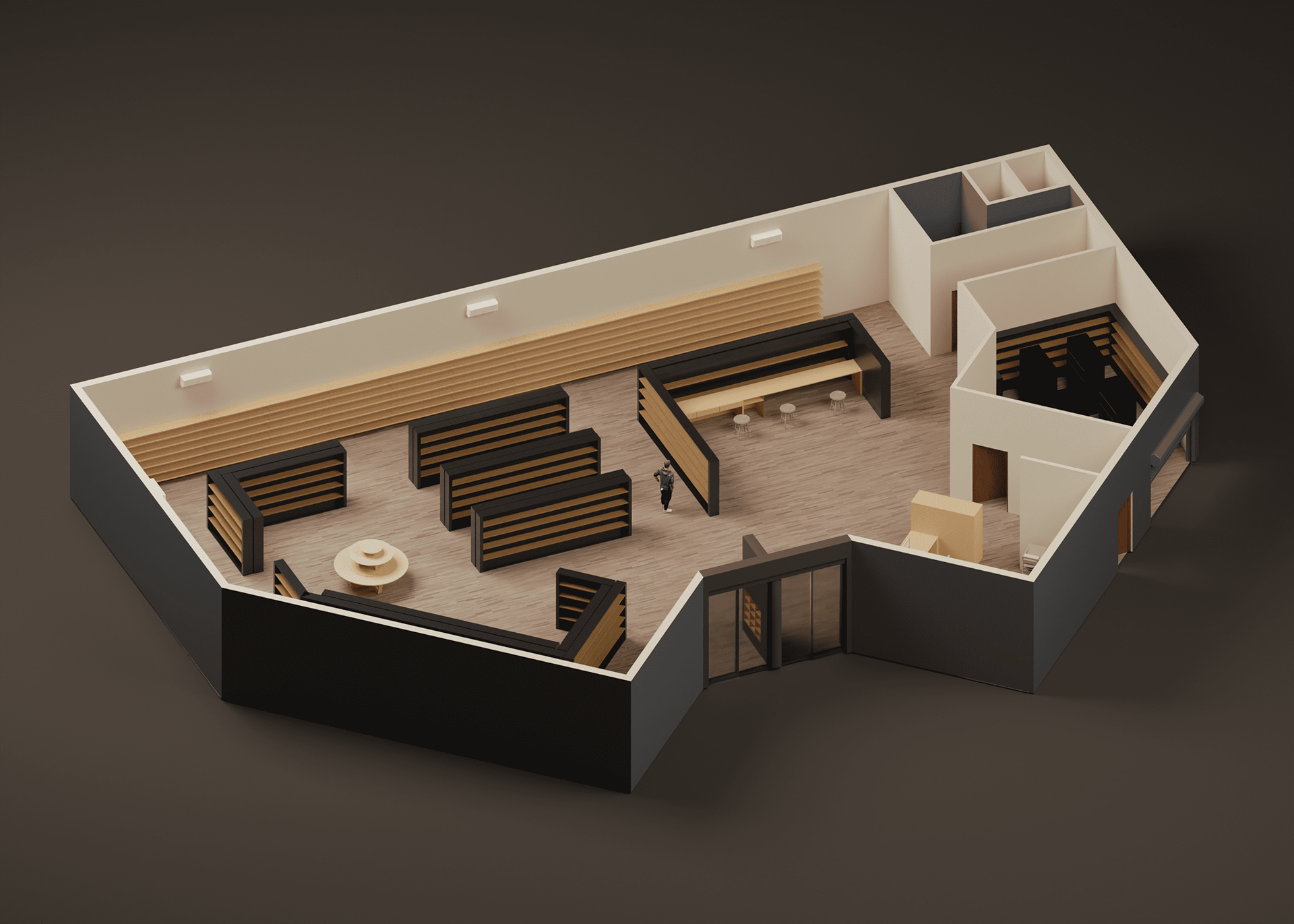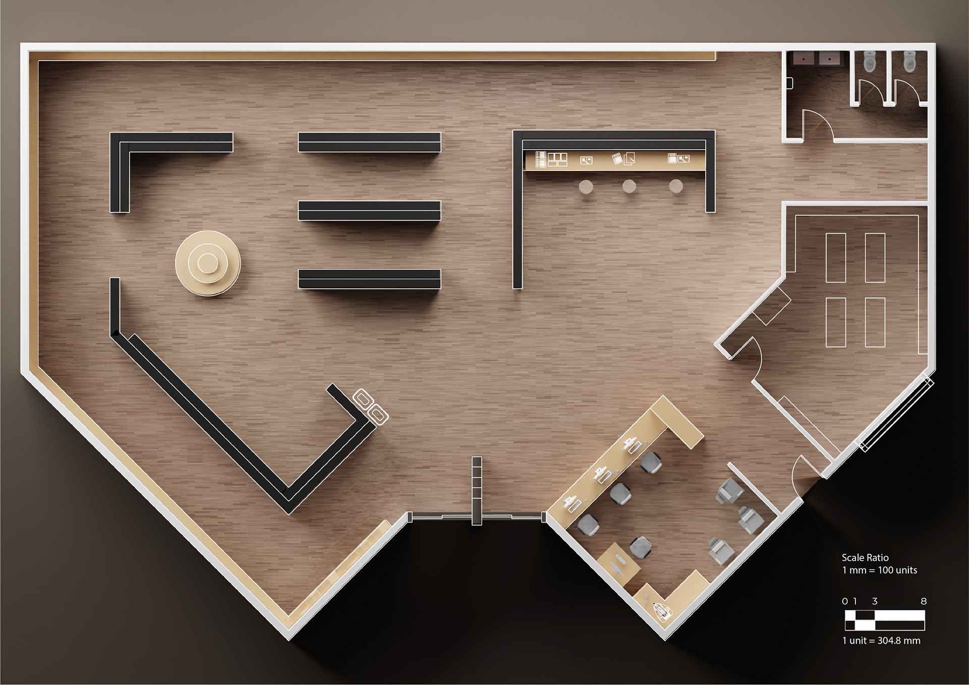 The brief of the assignment was to create a hypothetical brand and subsequently design a floor plan and renders for its store.